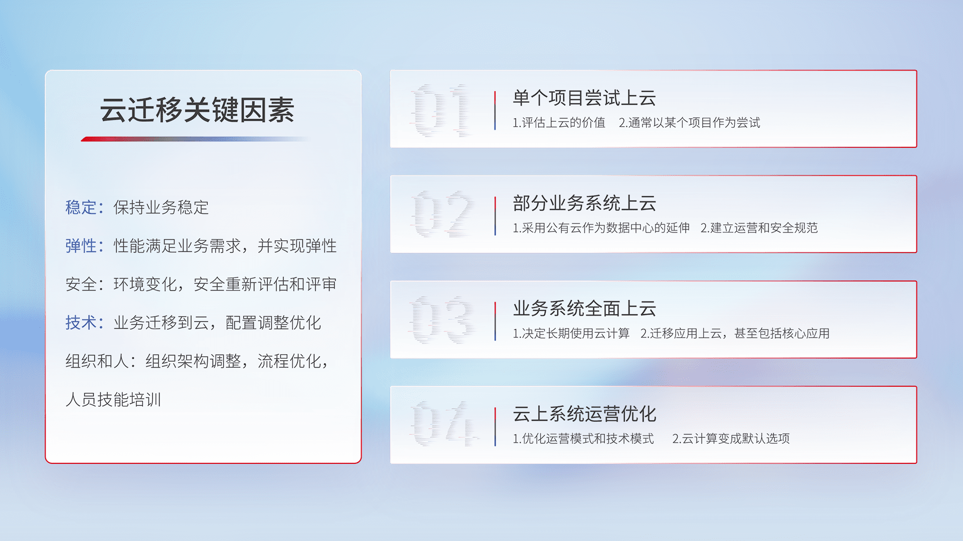 结合实际业务,,,从规划设计、、云平台选型、、云原生改造、、、数据迁移、、、集成交付,,迁移全过程为客户识别最佳上云路径,,,做好风险识别管理,,设计网络架构、、、、身份权限、、、、安全审计合规、、操作审计、、、日志审计、、监控告警策略、、多站点容灾设计等,,,对云上基础设施进行整体规划,,,提升IT治理水平,,以满足弹性、、、、高可用、、、高性能的需求。。。